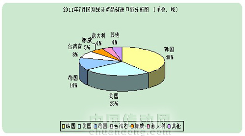 中國海關(guān)發(fā)布2011年7月多晶硅進(jìn)出口數(shù)字顯示:當(dāng)月進(jìn)口多晶硅5191噸,同比增長41%,環(huán)比增長10.62%,上半年累計(jì)進(jìn)口多晶硅達(dá)35581.237噸。另外,2011年7月份我國出口多晶硅115噸,累計(jì)出口多晶硅796噸。從進(jìn)出口總量上看,中國多晶硅進(jìn)出口比例仍處嚴(yán)重失調(diào)階段,國內(nèi)生產(chǎn)水平仍然無法滿足自身需求。