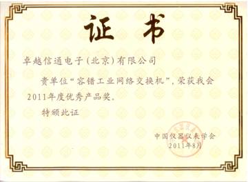 2011年8月,卓越信通電子(北京)有限公司“容錯工業(yè)交換機”產(chǎn)品喜獲中國儀器儀表協(xié)會頒發(fā)的“優(yōu)秀產(chǎn)品獎”,能夠獲此殊榮,卓越信通深感榮幸。