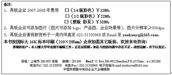 最近本公司接到大量用戶咨詢及投訴:稱紛紛收到上海地區(qū)發(fā)來《中國變頻器與傳動企業(yè)大全》再版的相關郵件及傳真,并向變頻器及相關廠商索取再版費用。郵件中所稱已刊登過的廠商資料模糊不清,使用為電腦掃描文件,明顯可以看出出自我刊所出版的《變頻器與傳動企業(yè)大全》。