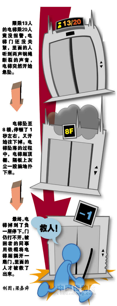 經(jīng)初步調(diào)查,事發(fā)電梯制造單位為杭州西子奧的斯電梯有限公司,2005年投入使用,額定載重量1000kg(13人)。不過(guò),9日凌晨實(shí)際進(jìn)入電梯有21人(14女7男)。