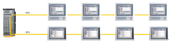 貝加萊設(shè)計(jì)的SDL(智能顯示接口)將所有的通信信號(hào)包括在一根電纜上,其中包括顯示信號(hào)線、觸摸操作信號(hào)線、Automation Panel面板上USB接口的信號(hào)線,以及面板的維護(hù)數(shù)據(jù)的傳送,最長(zhǎng)距離可達(dá)40米,并且一個(gè)SDL接口可以連接顯示相同畫面的4個(gè)Automation Panel,這樣距離可以達(dá)到160米。除了本身集成的一個(gè)SDL接口外,還可以在APC810上選加一個(gè)SDL接口,這樣就可以靈活接成下圖的顯示布局(2*160米):