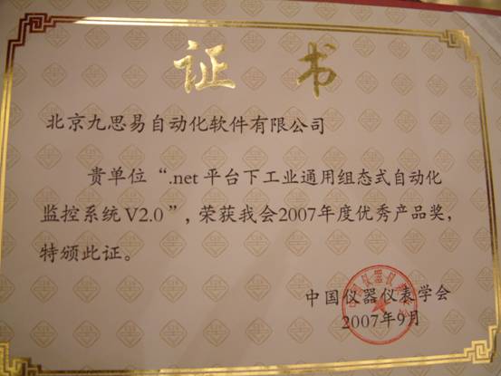金秋送爽,丹桂飄香,由中國(guó)儀器儀表學(xué)會(huì)主辦的“2007年度中國(guó)儀器儀表學(xué)會(huì)科學(xué)技術(shù)獎(jiǎng)”的頒獎(jiǎng)儀式9月18日晚在上海光大酒店盛大舉行。北京九思易自動(dòng)化軟件有限公司自主研發(fā)的“.net平臺(tái)下工業(yè)通用組態(tài)式自動(dòng)化監(jiān)控系統(tǒng) V2.0”(易控)憑其領(lǐng)先的技術(shù)和卓越的性能榮膺“中國(guó)儀器儀表學(xué)會(huì)科學(xué)技術(shù)獎(jiǎng)優(yōu)秀產(chǎn)品獎(jiǎng)”。