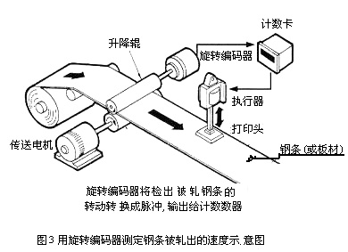 位移傳感器確定了液壓氣缸的位置并向控制器提供與金屬計量儀(或兩軋輥之間間距)相關(guān)聯(lián)的數(shù)字輸入信號。旋轉(zhuǎn)編碼器(TRD-K)固定在轉(zhuǎn)動的升降輥上,它顯示鋼條被軋出的速度,其示意見圖3所示。通過利用各種傳感器接收數(shù)據(jù),運(yùn)行于PXI控制器的LabVlEW RT對輸入做出響應(yīng)并生成改變液壓壓力的輸出信號,從而控制鋼條的規(guī)格。無論是厚度計量儀與位移傳感器均可采用光纖傳感器來實(shí)施。