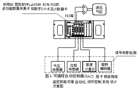 圖4為PAC用于鋼條(或扳材)規(guī)格進(jìn)行監(jiān)控的高可靠閉環(huán)控制系統(tǒng)-自動化處理的設(shè)計方案框圖.從圖中看出該設(shè)計方案中選擇了氣壓、位移、厚度傳感器及編碼器等信號傳感撿測部分、圖形軟件LabVlEW RT(實(shí)時)、PXl/CompactPCI多功能高精度采集卡、可編程自動控制器(PAC)。