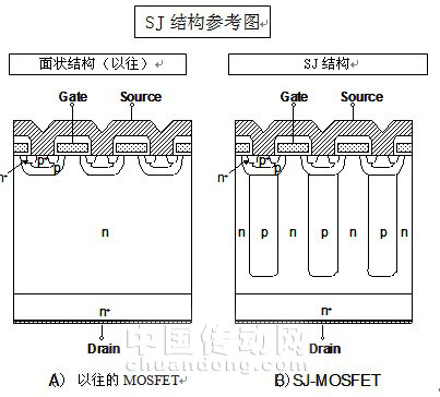 其特點是,由于是使MOSFET的耐壓層的p區(qū)和n區(qū)交互存在的結(jié)構(gòu),可使n區(qū)的雜質(zhì)濃度提高,所以可大幅度降低阻值。
