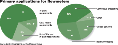在對(duì)購買和具體指定流量計(jì)的受訪者的調(diào)查之中,66%用于工廠里,21%用于OEM再銷售,其余13%同時(shí)滿足上兩種要求。連續(xù)流程為主要應(yīng)用占42%,批量處理占28%和設(shè)備服務(wù)占23%,其余用途占7%。這項(xiàng)調(diào)查同05年6月一篇文章中記錄的調(diào)查結(jié)果很相似。