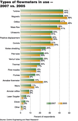 從2005年到2007年,流量計(jì)使用的類型有了改變。渦輪流量計(jì)(44%)和電磁流