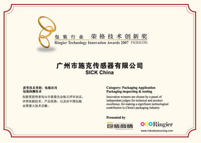 經(jīng)過(guò)用戶推薦和專家公正評(píng)審,擁有超過(guò)60年生產(chǎn)研發(fā)傳感器歷史的施克公司憑借在包裝行業(yè)多年積累的深厚技術(shù)實(shí)力,為客戶帶來(lái)了成熟領(lǐng)先的產(chǎn)品和優(yōu)質(zhì)的服務(wù),并將領(lǐng)先業(yè)界的行業(yè)解決方案理念帶入中國(guó),對(duì)中國(guó)包裝行業(yè)的自動(dòng)化進(jìn)程做出了重大貢獻(xiàn),榮獲“2007包裝行業(yè)榮格技術(shù)創(chuàng)新獎(jiǎng)”。