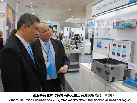 全球電源與散熱系統(tǒng)解決方案的領導者臺達集團于2012漢諾威工業(yè)展(HannoverMesse)中整合臺達能源管理領域產品及技術,為客戶提供客制化的能源管理服務。同時也發(fā)布2011年“企業(yè)社會責任報告”,臺達的高效率節(jié)能產品及服務總計為客戶節(jié)省了33億度(KWH)的用電量,約當于為地球降低202萬噸的碳排放,相較于2010年的減碳成效,更提升了10%,為環(huán)保節(jié)能做出具體貢獻。2011年獲評為臺灣二十大國際品牌的臺達集團,由副董事長暨執(zhí)行長海英俊親自領軍參展,充分展現(xiàn)以自有品牌深耕全球市場的決心,開幕首日即吸引數(shù)百位來自全球近五十余國的貴賓、客戶與經銷商來訪,臺灣駐德國代表魏武煉、經濟組長范德安與外貿協(xié)會張曉茜組長,亦親臨會場表達對臺達推廣“品牌“的肯定。