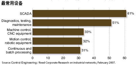 多數(shù)公司(61%)使用網絡驅動的SCADA(數(shù)據采集和監(jiān)控系統(tǒng))系統(tǒng)(見最常用設備圖),而很多公司(51%)把它的功能拓展到診斷,測試及維護。另外的一些回答建議把離散和流程工業(yè)的需求分開。