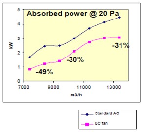 EC風(fēng)機與交流無蝸殼離心風(fēng)機耗電比較:EC風(fēng)機能耗低,節(jié)能效果明顯;不同風(fēng)量下EC風(fēng)機可節(jié)能30%以上;通過微電腦控制,可進(jìn)行無級調(diào)速;空調(diào)能效比可達(dá)到3.0以上。