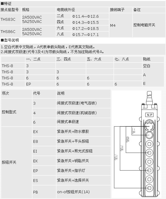 ● 本開關為防水之懸吊式吊車開關,外殼采用ABS樹脂,絕緣佳,即使屋外使用,亦安全無虞。