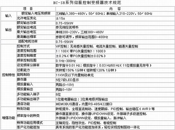 產(chǎn)品介紹 HC-SR系列伺服控制變頻器 功能概述 HC-SR系列交流伺服控制變頻器采用模塊化設(shè)計理念和優(yōu)化的PWM生成技術(shù),輸出諧波小、轉(zhuǎn)矩大、噪音低、電磁兼容性好、控制精度高、操作簡便靈活、適應(yīng)性廣闊。該系列產(chǎn)品不但能驅(qū)動交流永磁同步電機(jī),也能驅(qū)動普通三相異步電機(jī);并且,系統(tǒng)追加了許多客戶化功能,可以輕松實(shí)現(xiàn)控制驅(qū)動一體化。 伺服系統(tǒng)是機(jī)電產(chǎn)品中的重要環(huán)節(jié),它能提供最高水平的動態(tài)響應(yīng)和扭矩密度,所以拖動系統(tǒng)的發(fā)展趨勢是用交流伺服驅(qū)動取代傳統(tǒng)的液壓系統(tǒng)、直流電機(jī)和步進(jìn)電機(jī)等,以便使系統(tǒng)性能達(dá)到一個全新的水平,包括更短的周期、更高的生產(chǎn)率、更好的可靠性和更長的壽命。赫爾克的HC-SR系列通用交流伺服變頻器正是考慮用戶的這一需求而研發(fā)生產(chǎn)的。 技術(shù)規(guī)范 外形尺寸、安裝尺寸