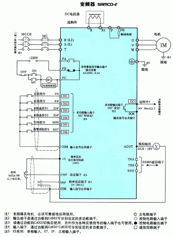 一、Samco-e系列迷你型的特點 ● 外形小型化設(shè)計,安裝方便。 ● 標準配備調(diào)節(jié)頻率用電位器,操作簡便。 ● 可方便地將操作面板引出。 ● 具有6路外部輸入多功能控制端子。 ● 含V/f分離功能,適用于特殊的應(yīng)用場合。 ● 全系列均含制動單元(制動電阻為選購件)。 ● 具有過電流、過載、欠壓、過壓、輸入及輸出缺相、散熱器過熱等多種保護功能。 ● 具有自動節(jié)能功能,可實現(xiàn)電視高效率節(jié)能運轉(zhuǎn)。 ● 標準配備RS485通訊接口。 ● 內(nèi)置PID控制功能,便于實現(xiàn)閉環(huán)控制。 ● 變更數(shù)據(jù)查詢功能:可以簡單檢索變更了的數(shù)據(jù)。 ● 數(shù)據(jù)的復(fù)制功能(需選購SAMCO-Um05操作面板)。 二、端子接線圖