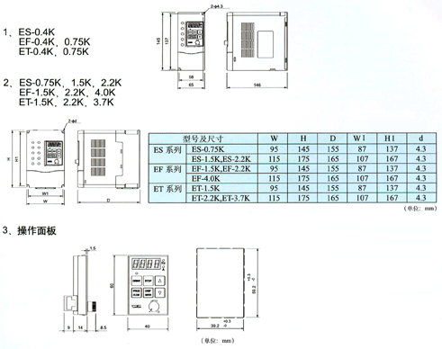 ※ 1:額定容量為200V系列時輸出電壓220V時,400V系列為輸出電壓是400V時的容量。 ※ 2:當輸入電壓為AC400V以上時,將根據(jù)輸出功率降低額定電流。 ※ 3:載波頻率的最大值根據(jù)變頻器容量及運轉(zhuǎn)狀態(tài)而變化。 ※ 4:最大輸出頻率為5V、10V、20mA時的頻率。 ※ 5:可適應(yīng)運輸?shù)榷虝r間的溫度。 ※ 6:請將載波頻率設(shè)定為cd051=9以下的設(shè)定下使用。 注:本規(guī)格參數(shù)僅供參考,如有變化恕不另行通知。 五、安裝尺寸