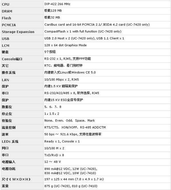 適合工業(yè)應(yīng)用的設(shè)計(jì) ●Wall mount設(shè)計(jì)讓您安裝容易 UC-7400精巧的體積為您節(jié)省許多空間,而wall-mount的設(shè)計(jì)讓您在安裝的時(shí)候有更多的彈性。 ●無風(fēng)扇、無硬盤設(shè)計(jì)計(jì) 因?yàn)閁C-7400利用內(nèi)建的Flash來儲(chǔ)存,以及利用CF來擴(kuò)充內(nèi)存,因此,因?yàn)橛脖P損壞而導(dǎo)致整個(gè)系統(tǒng)MTBF較低的情況就可避免。RISC低耗熱的特性使得IXP-422 CPU幾乎不會(huì)產(chǎn)生熱量,因此,UC-7400不需要風(fēng)扇來替系統(tǒng)降溫,提供您一個(gè)更穩(wěn)定的系統(tǒng)。 ●適應(yīng)現(xiàn)場電源供應(yīng) 12到48 VDC電源輸入的設(shè)計(jì)讓UC-7400可適應(yīng)現(xiàn)場24 VDC或48 VDC電源。另可選購AC電源適配器,以符合110到240 VAC電源輸入。 應(yīng)用 ●協(xié)議轉(zhuǎn)換 ●遠(yuǎn)端存取 ●Event Handling ●保障設(shè)備聯(lián)網(wǎng)服務(wù)器的安全 目標(biāo)市場 ●工業(yè)自動(dòng)化 ●大樓自動(dòng)化 ●交通自動(dòng)化 ●SCADA 系統(tǒng) ●軍事 特點(diǎn) ●Intel Xscale IXP-422 266Mhz處理器 ●128MB板載RAM,32MB Flash Disk ●8個(gè)RS-232/422/485串口 ●2個(gè)10/100Mbps以太網(wǎng)口 ●USB 2.0 Host ●PCMCIA,CompactFlash及無線網(wǎng)卡插槽(支持 802.11b/802.11g) ●LCM顯示屏和鍵盤方便操作 ●立即可用的Linux/WinCE.NET通信平臺(tái) ●導(dǎo)軌和壁掛安裝 ●穩(wěn)定,無風(fēng)扇設(shè)計(jì) 規(guī)格硬件 [align=center] [/align] 軟件規(guī)格Linux