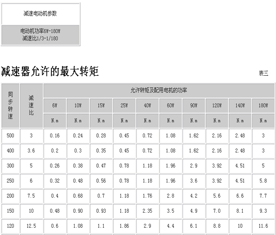 2、為避免減速器因過載而損壞,在選用低速時(shí)轉(zhuǎn)矩不得超過表中規(guī)定值。