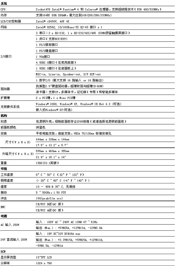* 15" TFT LCD Intel® Pentium® 4 和 Celeron® 處理器工業(yè)平板電腦