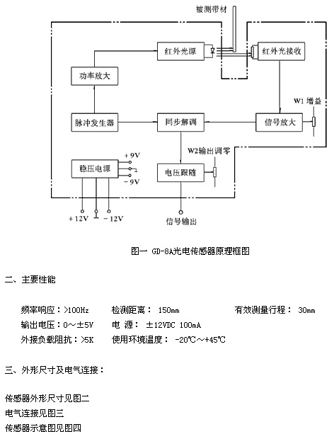 (見圖一GD-8A光電傳感器原理框圖)由脈沖發(fā)生器產(chǎn)生的脈沖波分為二路,一路輸入功率放大器以驅(qū)動紅外發(fā)光管發(fā)出高頻光脈沖,另一路輸入同步解調(diào)器作為解調(diào)信號。紅外接收管收到微弱的脈沖信號經(jīng)放大后也輸入同步解調(diào)器。當(dāng)光路上有帶材運(yùn)動并遮擋了光信號時(shí),接收光信號的強(qiáng)弱便發(fā)生了變化,這個(gè)變化的信號經(jīng)同步解調(diào)后變成電壓信號,經(jīng)由電壓跟隨器輸出。由于電路中采用了同步解調(diào),因此外界干擾信號經(jīng)解調(diào)后被濾除,使傳感器有了很強(qiáng)的抗干擾能力。