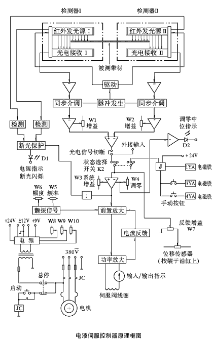 CSEC-20電液伺服控制器是為鋼鐵、橡膠、造紙等行業(yè)進行非透明帶材連續(xù)糾偏(CPC)的專用配套控制器。它主要由寬光束紅外對中光電檢測傳感器(包括檢測器及前置放大器)、電液伺服放大器及泵電機驅動等部分組成。紅外光電傳感器的檢測寬度變化范圍最大可達400mm,所以被測帶材寬度有較大變化時,也不必改變檢測器的相對位置,由于采用紅外調制光源,故該傳感器具有靈敏度高,抗干擾能力強的特點,可以在明暗變化很大的環(huán)境下長期可靠地工作。電液伺服放大器采用共地端的電流負反饋形式,故輸出電流不受引線電阻變化的影響,無論負載本身短路,還是輸出線對地短路,都不會損壞電子部件。由于上述原因,所以本伺服控制器具有工作壽命長,可靠性高的特點。并且能外接本所制造的GD6A、GD8A等光電傳感器以進行帶材邊緣的伺服控制。