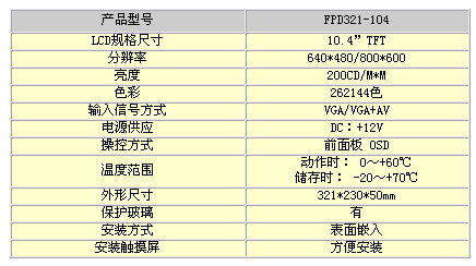 FPD321-104是為工業(yè)用途而設(shè)計(jì)的LCD平板顯示器,結(jié)構(gòu)牢固,安裝使用方便。可方便裝觸摸屏。適合于電磁干擾較大和低功耗的工業(yè)現(xiàn)場(chǎng)人機(jī)界面,過程控制等場(chǎng)合。