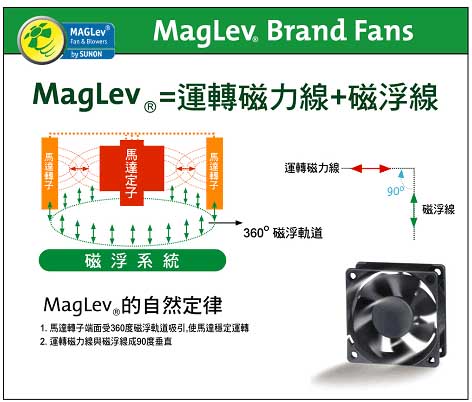 專利MagLev設(shè)計(jì),風(fēng)扇運(yùn)用磁力原理使扇葉轉(zhuǎn)動(dòng),且運(yùn)用磁浮力吸住扇葉成360度定軌且定點(diǎn)之穩(wěn)定旋轉(zhuǎn)。利用這種吸附效果,徹底解決傳統(tǒng)馬達(dá)風(fēng)扇運(yùn)轉(zhuǎn)時(shí)的晃動(dòng)與震動(dòng)狀況。同時(shí),扇葉旋轉(zhuǎn)是懸空的,軸心與軸承并無直接接觸摩擦,故低噪音、耐高溫、長壽命。