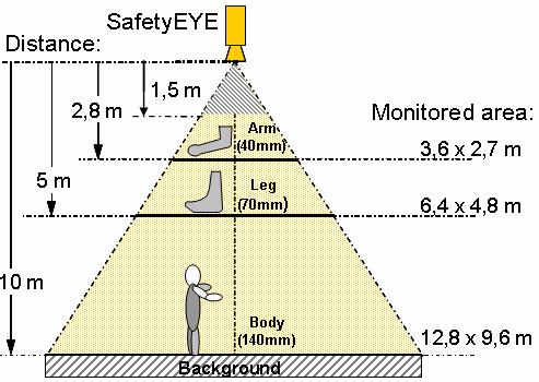 SafetyEYE是世界上第一臺(tái)安全照相系統(tǒng),采用其安裝在被監(jiān)控區(qū)域的上方,能夠?qū)ο路降膮^(qū)域進(jìn)行三維立體的監(jiān)控,其最大的安裝高度為10m,監(jiān)控面積為120m2,安全等級(jí)達(dá)到SIL2。