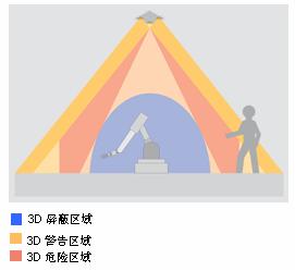 警告區(qū)域—當(dāng)操作人員觸碰到該區(qū)域時(shí),SafetyEYE會(huì)觸發(fā)安全控制器使得機(jī)器以慢速運(yùn)行,這樣可以減少機(jī)器對(duì)操作人員危險(xiǎn)的同時(shí)還可以提醒操作人員他已經(jīng)進(jìn)入警告區(qū)域了。