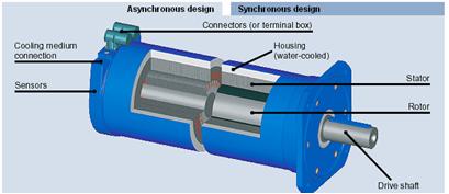 該型電機(jī)分為異步和同步設(shè)計(jì),采用在定子外殼設(shè)計(jì)的水冷層來實(shí)現(xiàn)水冷,進(jìn)水口和出水口設(shè)計(jì)在電機(jī)的后端,流經(jīng)整個(gè)電機(jī)機(jī)身后經(jīng)另一個(gè)出口出水。
