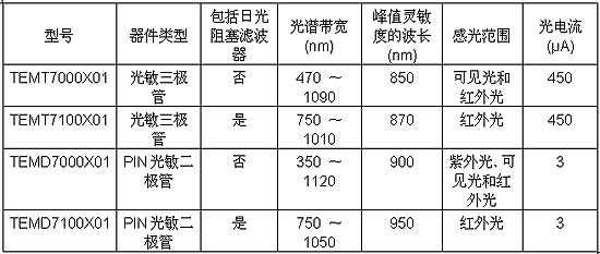光敏二極管具有100ns的快速響應時間,光譜靈敏度范圍為350nm~1120nm或750nm~1050nm;光敏三級管的光電流高達450μA,光譜靈敏度范圍為470nm~1090nm或750nm~1010nm,環(huán)氧樹脂鏡片可過濾可見光。TEMD7x00X01和TEMT7x00X01器件具有1nA的暗電流和±60°的半靈敏度角,并且與近期發(fā)布的940nm波長的發(fā)射器VSMB1940X01相匹配。