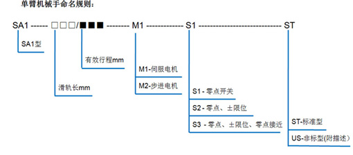 具體為SA1型單臂機械手,滑軌長300mm,有效行程195mm,不含電機及其驅(qū)動器,零點開關(guān),標準型。